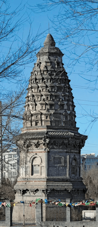 良乡多宝佛塔,俗称昊天塔,根据清光绪年间的县志记载始建于隋代,而现存塔体系明显的辽代风格,为平面八角形五级楼阁式砖塔,高44.5米。